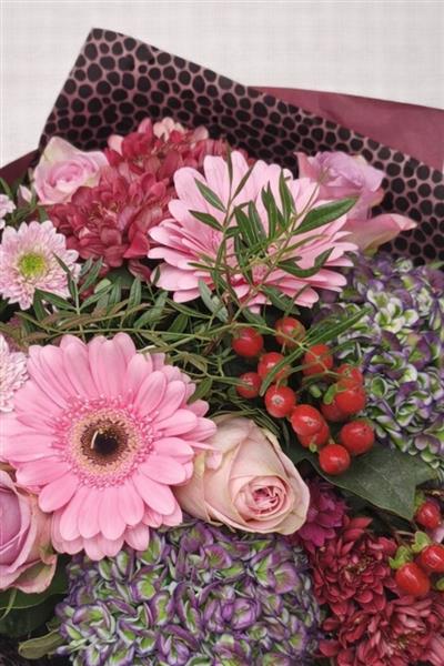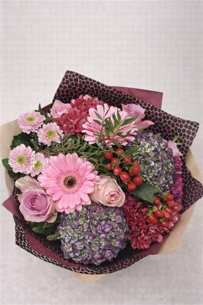 A beautifully hand-tied bouquet featuring soft pink gerberas, delicate roses, lush hydrangea, seasonal chrysanthemums, and rich berry accents, finished with complementary foliage. Designed in a romantic garden style, this bouquet is full of warmth, texture, and seasonal charm.