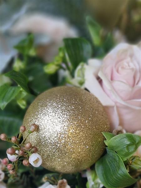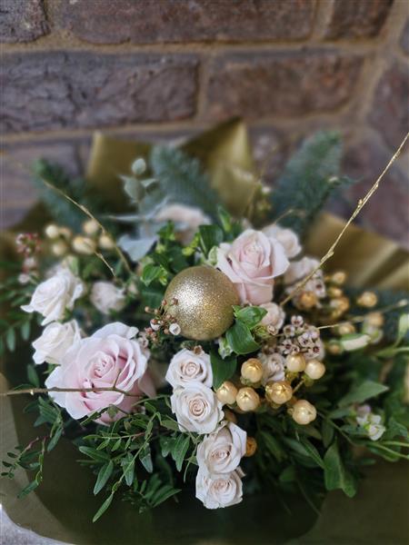 A soft , elegant mix of blush roses, waxflower, winter greenery, and gold accents, finished with a festive bauble. Perfect for a modern Christmas gift