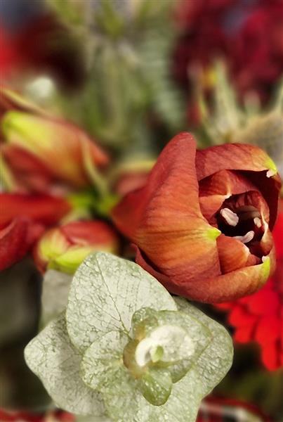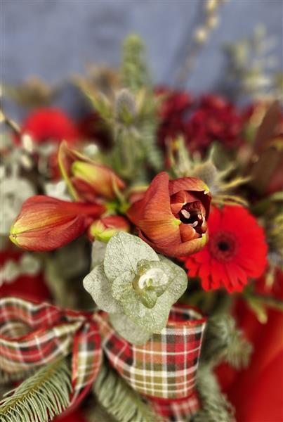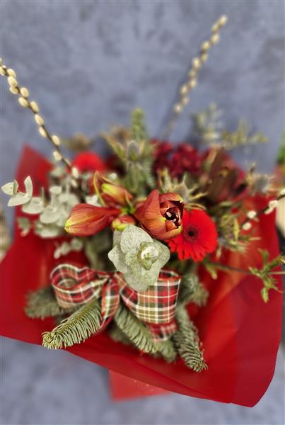 A warm ,festive mix of red Amaryllis, germini, winter greenery and blue thistle .Rich, bold and perfect for a traditional Christmas feel.