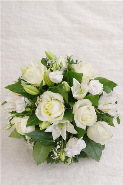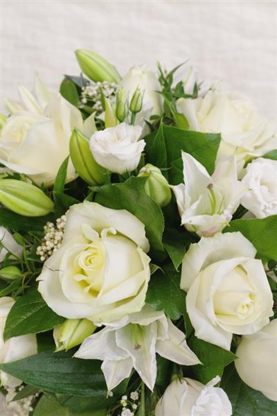 A timeless hand-tied bouquet featuring elegant white roses, lilies, and Lisianthus, complemented with fresh seasonal foliage. Soft, classic, and beautifully balanced, this bouquet is perfect for sympathy, weddings, anniversaries, or sending a thoughtful message of care. Standard 6 roses, 3 lilies 3 lizzies. Large 12 roses,6 lilies 5 lizzies.