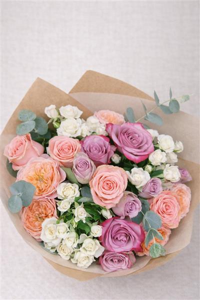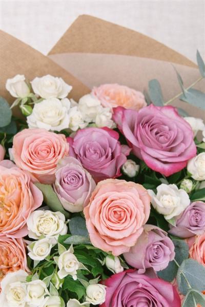 A beautifully hand-tied bouquet featuring a soft mix of peach, blush and lilac roses, delicate white spray roses, and fresh eucalyptus foliage. Designed in a romantic garden style, this bouquet is full of texture, gentle colour and timeless elegance — perfect for birthdays, anniversaries, or thoughtful everyday gifting.