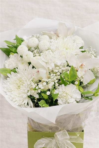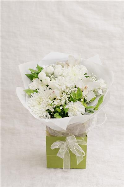 A beautifully elegant arrangement of fresh white flowers including chrysanthemums, orchids, and seasonal blooms, softly arranged in a stylish presentation box. Designed to convey calm, purity, and grace, this arrangement is perfect for sympathy, remembrance, or sending a gentle message of care.