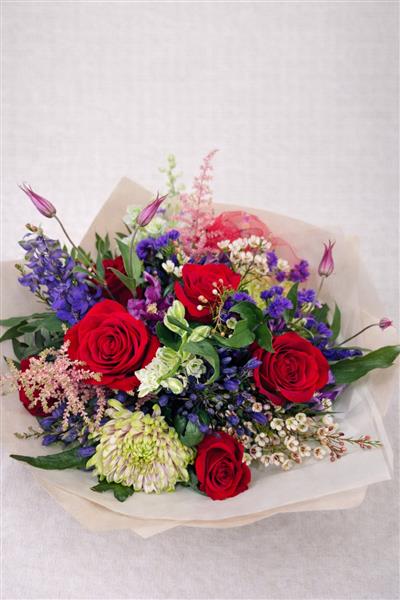 A striking hand-tied bouquet featuring rich red roses, vibrant purple and blue seasonal flowers, soft green chrysanthemum, and delicate waxflower, finished with complementary foliage. Designed in a natural garden style, this bouquet is full of colour, texture, and character — perfect for birthdays, celebrations, or when you want to make a bold statement.