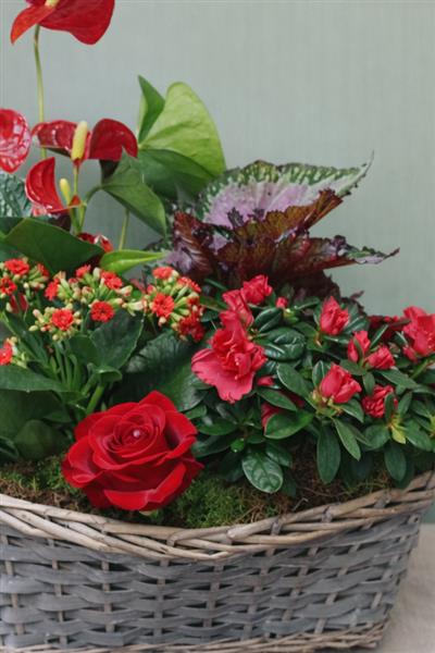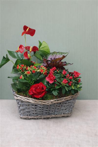 A beautiful mixed planted basket featuring a selection of red flowering plants and lush green foliage, thoughtfully arranged in a rustic wicker basket. Designed for lasting enjoyment, this arrangement brings vibrant colour and natural charm to any home, making it a perfect gift for birthdays, thank-yous, or special occasions.