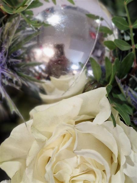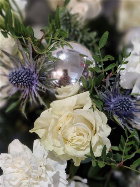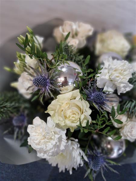 A cool, elegant blend of cream roses, white blooms, winter greenery and icy blue thistle, accented with silver baubles for a modern winter look. Fresh, crisp and beautifully seasonal.