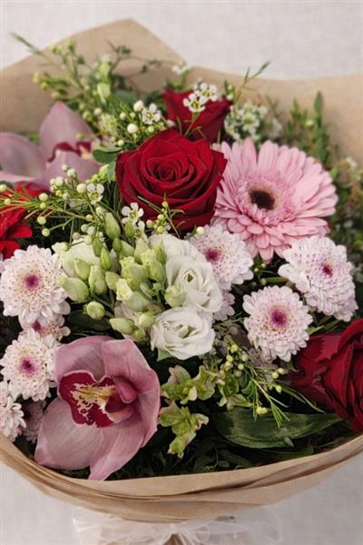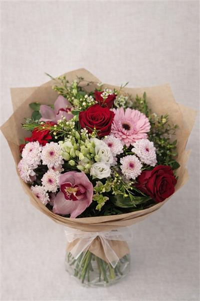 A beautifully balanced hand-tied bouquet featuring large, red roses, soft pink gerbera, delicate chrysanthemums, elegant orchids, and seasonal foliage. A romantic mix of textures and tones, perfect for birthdays, anniversaries, or simply to brighten someone’s day.