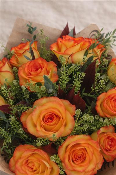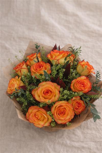 A classic bouquet of twelve large-headed orange roses, finished with complementary foliage for a fresh, modern look. Rich in colour and full of life, this bouquet expresses passion, gratitude, and heartfelt appreciation. Large variants has 24 roses.