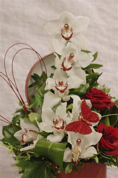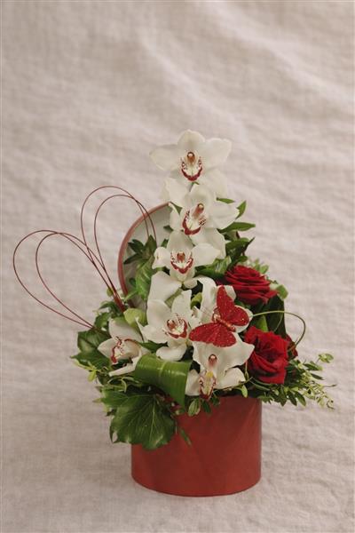 A luxurious hatbox arrangement featuring elegant white cymbidium orchids paired with rich red roses, nestled in seasonal foliage. Designed in a stylish hatbox, this arrangement offers a modern yet timeless look, perfect for birthdays, anniversaries, romantic gestures, or when only something truly special will do.