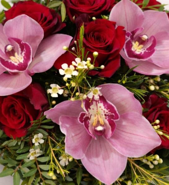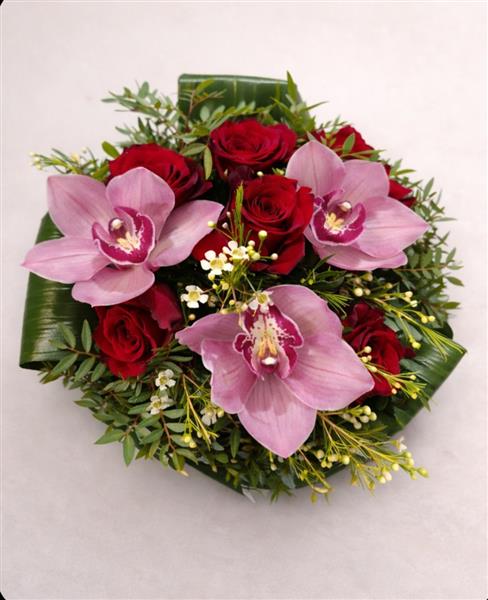 Six premium large headed Colombian roses are beautifully combined with cerise orchids, soft wax flower, and finished with aspidistra leaves. A rich and elegant bouquet designed to impress.