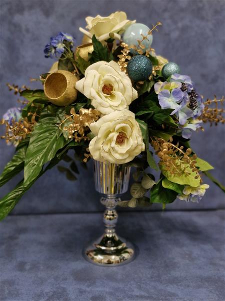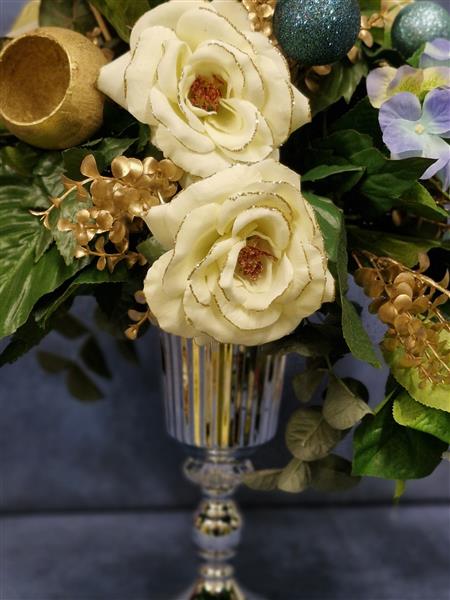 A beautifully balanced artificial arrangement blending creamy roses, dusky Hydrangea tones and shimmering gold accents Timeless, stylish and made to shine year after year