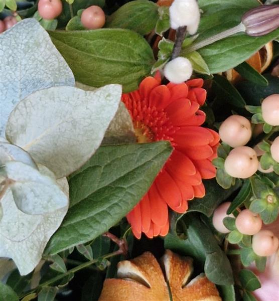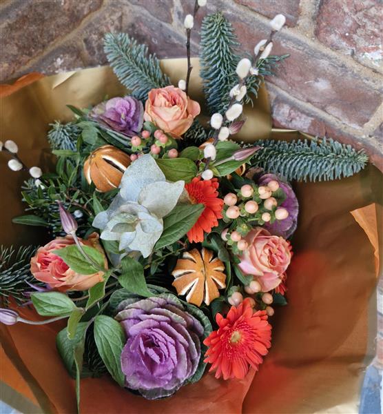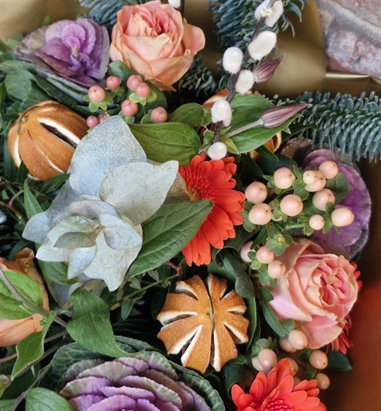 A fresh, festive mix of orange roses, vibrant Germini,purple ornamental brassica and dried orange fruits. Bright, modern and full of winter warmth.
